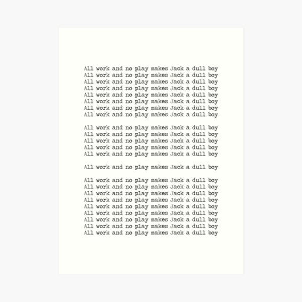 A bad workman quarrels with his tools. 'dull' here might refer here to being: It implies that without time off from work, a person becomes both bored and boring. A guilty conscience needs no accuser. A family heads to an isolated hotel for the winter where an evil and spiritual presence influences the father into violence, while his psychic son sees. All work and no play makes jack a. All work and no play makes jack a dull boy is a proverb. Specifically, that it makes us 'dull'. Rather than typing his horribly famous sentence, he could have been dictating and recording his thoughts! It is not healthy for someone to work all the time and never play. Boring or uninterested, bored or feeling weary conclusion: The first record of the proverb in print that i know of is in the collections of proverbs published by james howell, paroimiographia proverbs, or, old sayed sawes & adages in english: Being googleable doesn't in itself make it a bad question.